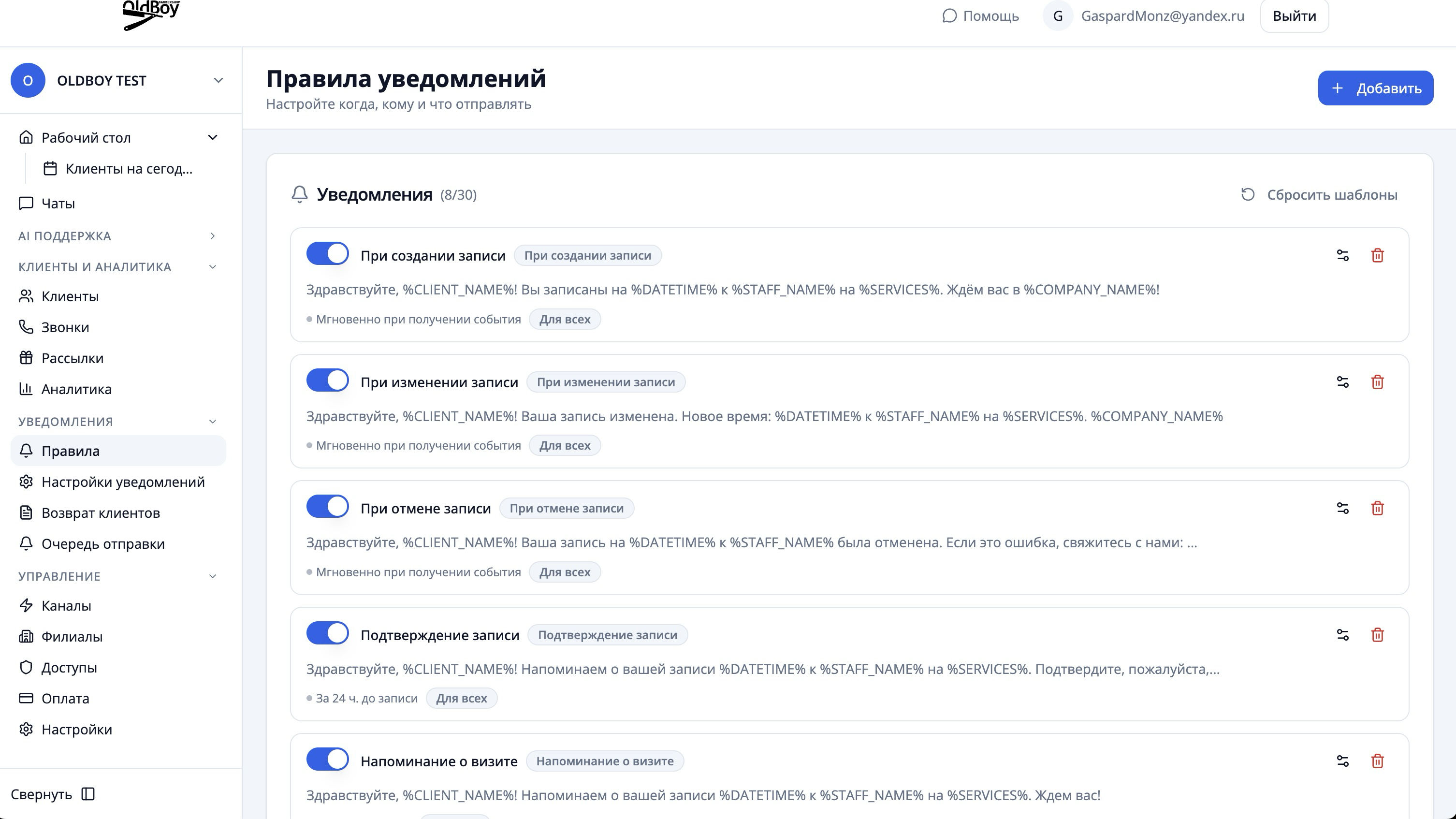 Настройка уведомленийНастройка уведомлений Перейдите на вкладку "Правила" — здесь находятся базовые шаблоны уведомлений Настройте каскад уведомлений под ваши нужды