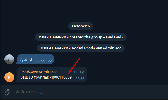 Бот отправит вам ID чата. Скопируйте его полностью, включая знак минус, если он есть