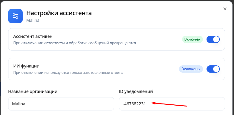 Вставьте скопированный ID чата в соответствующее поле настроек