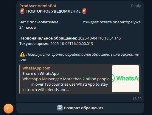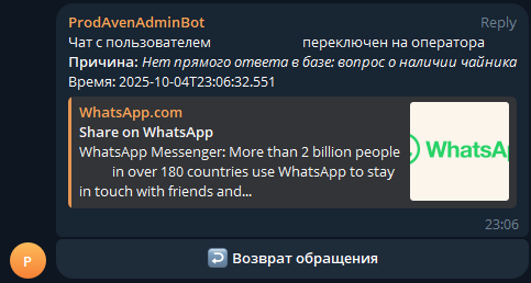 При переводе диалога на оператора бот сразу отправит уведомление: