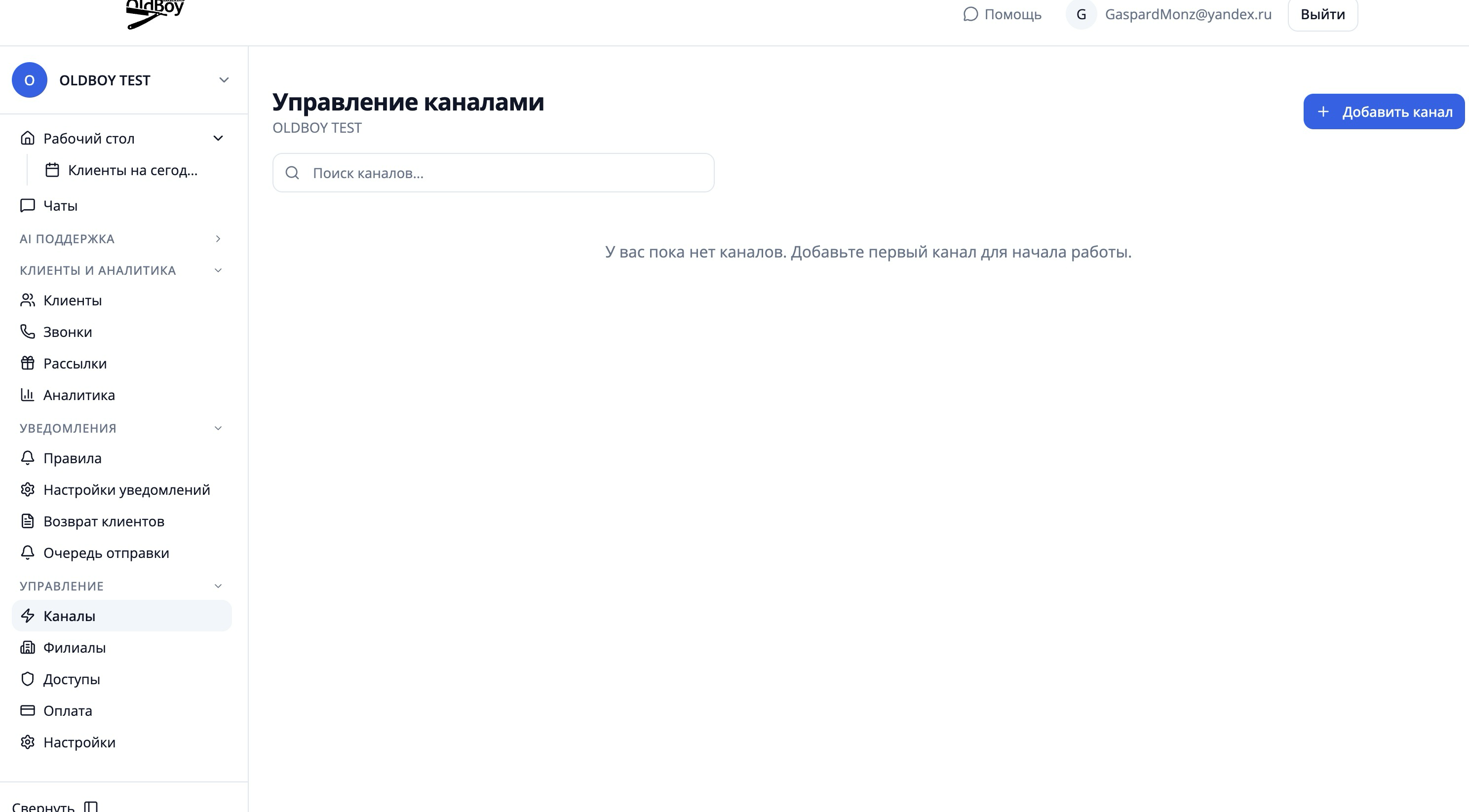 - Нажмите "Добавить канал" и выберите тип Telegram