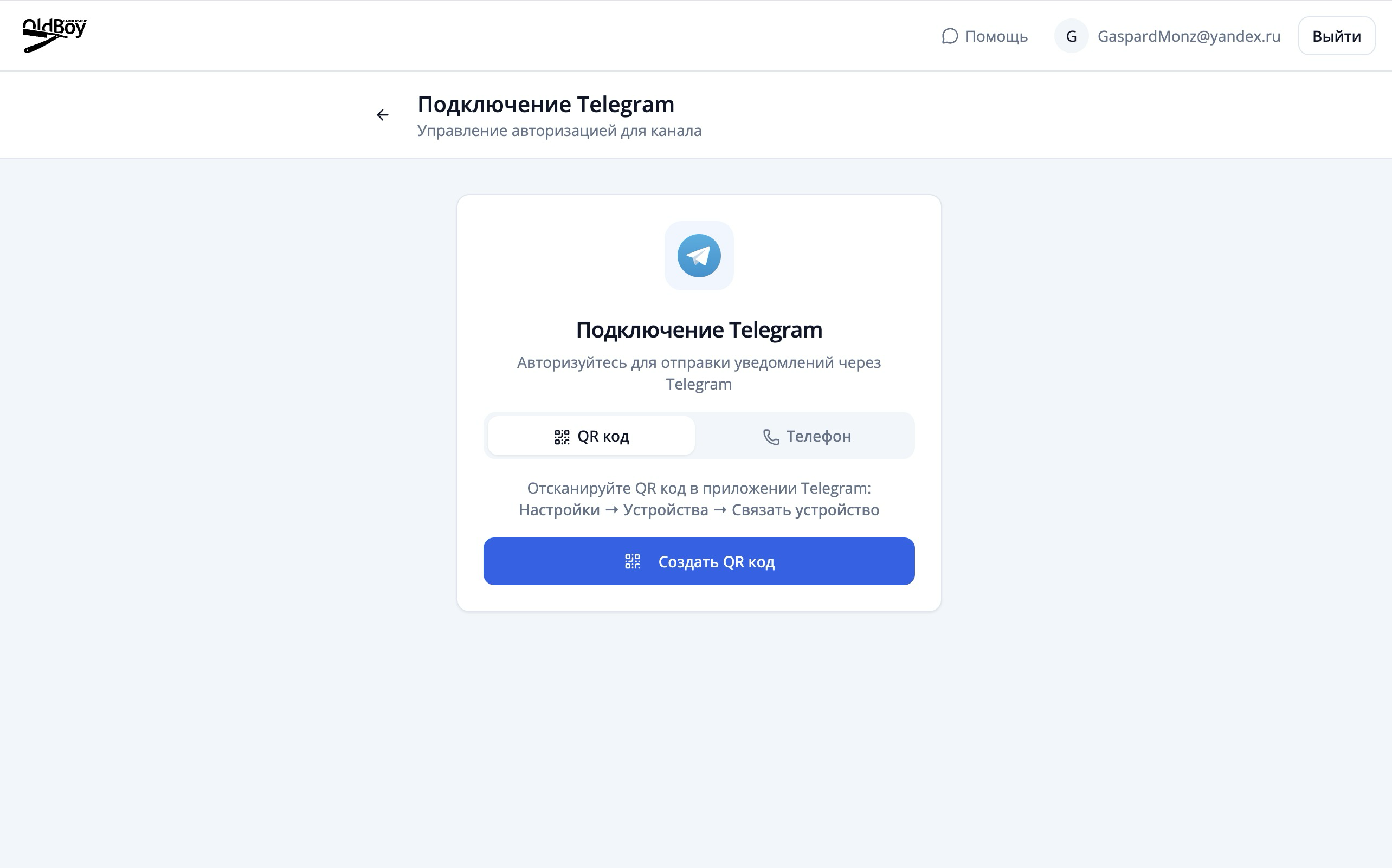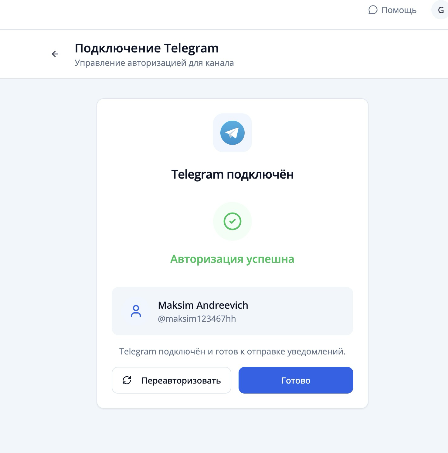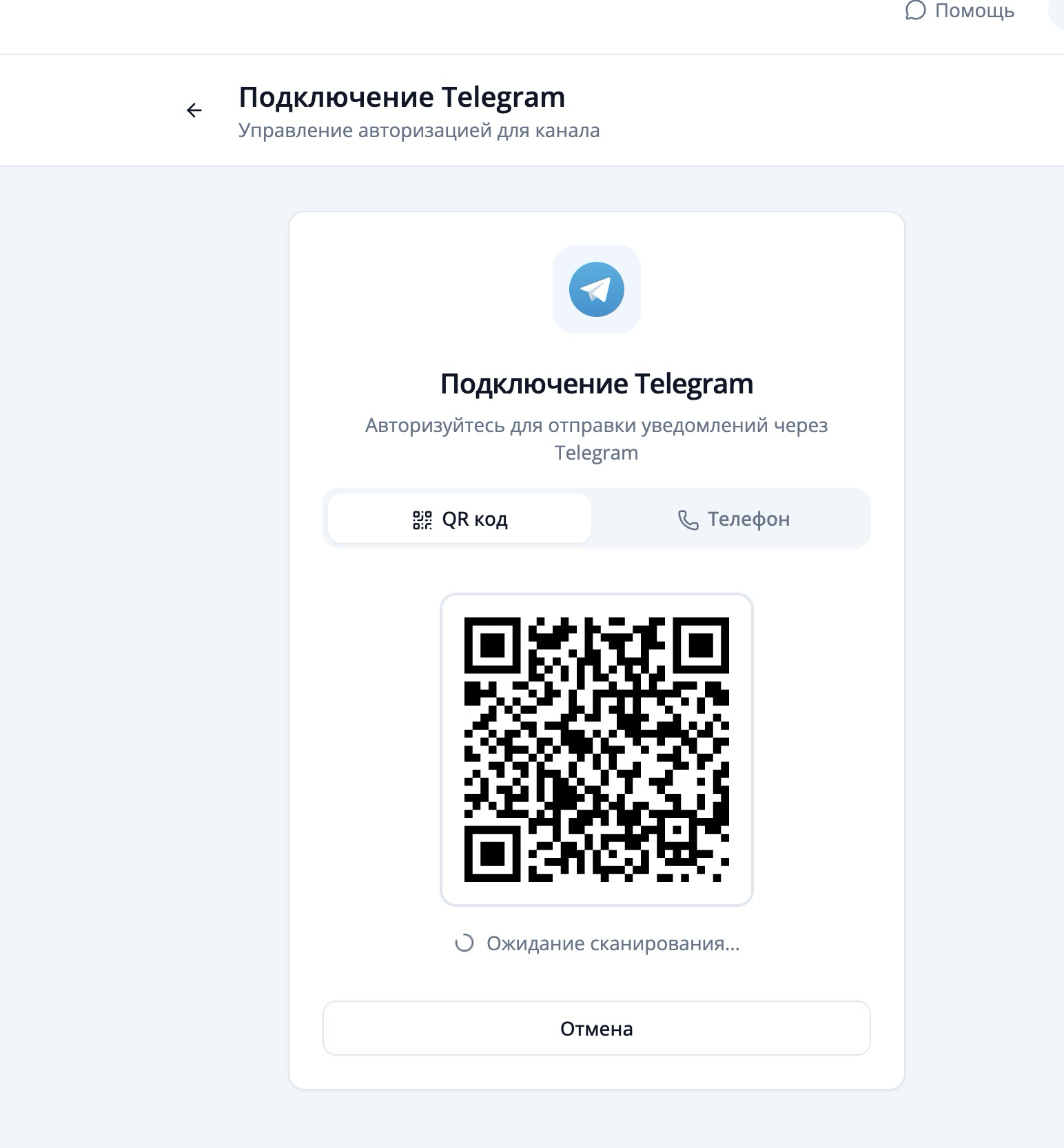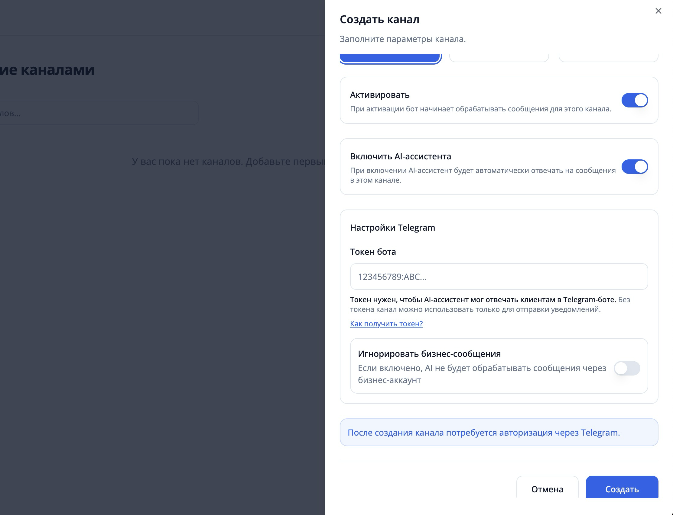 - Создайте канал Telegram — если у вас нет бот-токена, система предложит привязку через номер телефона