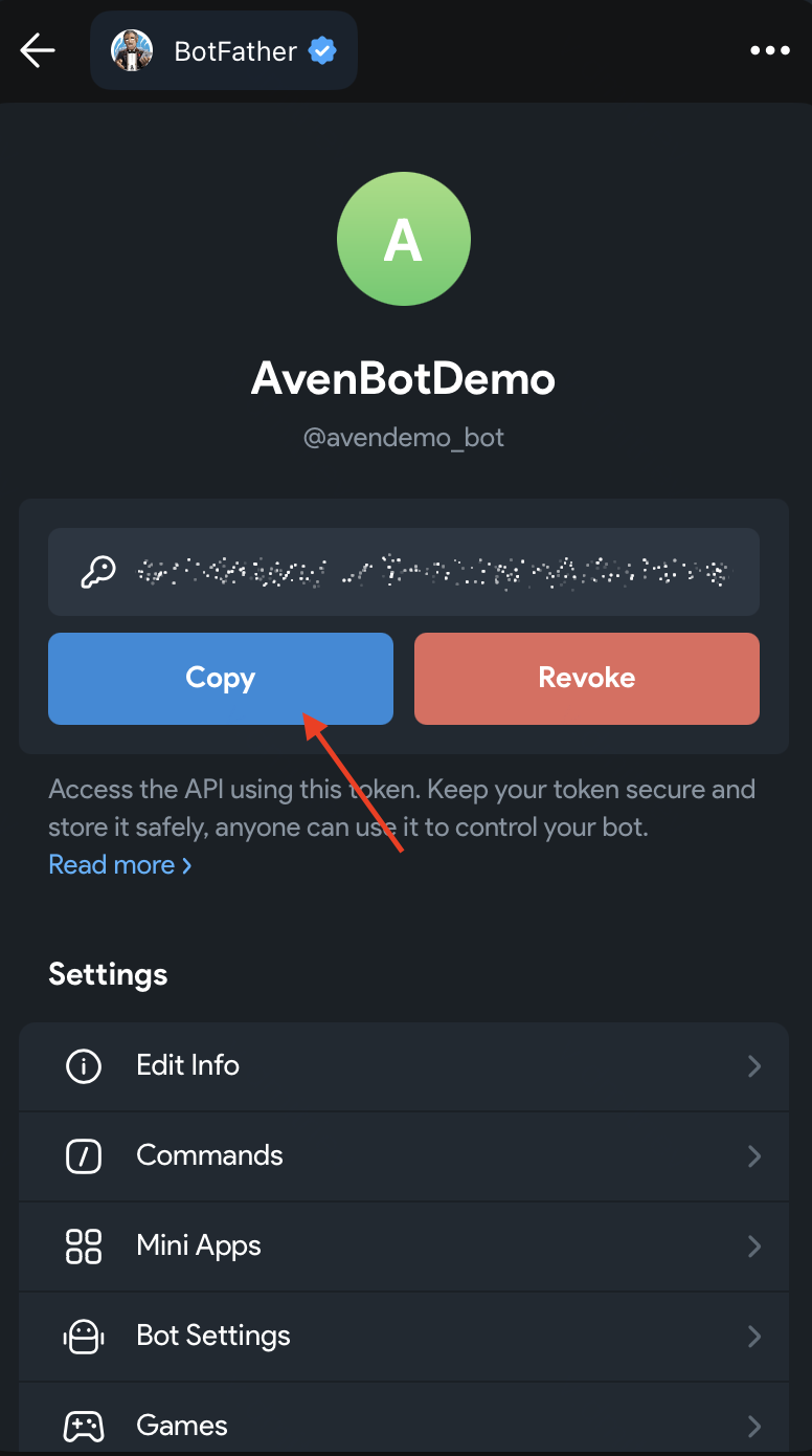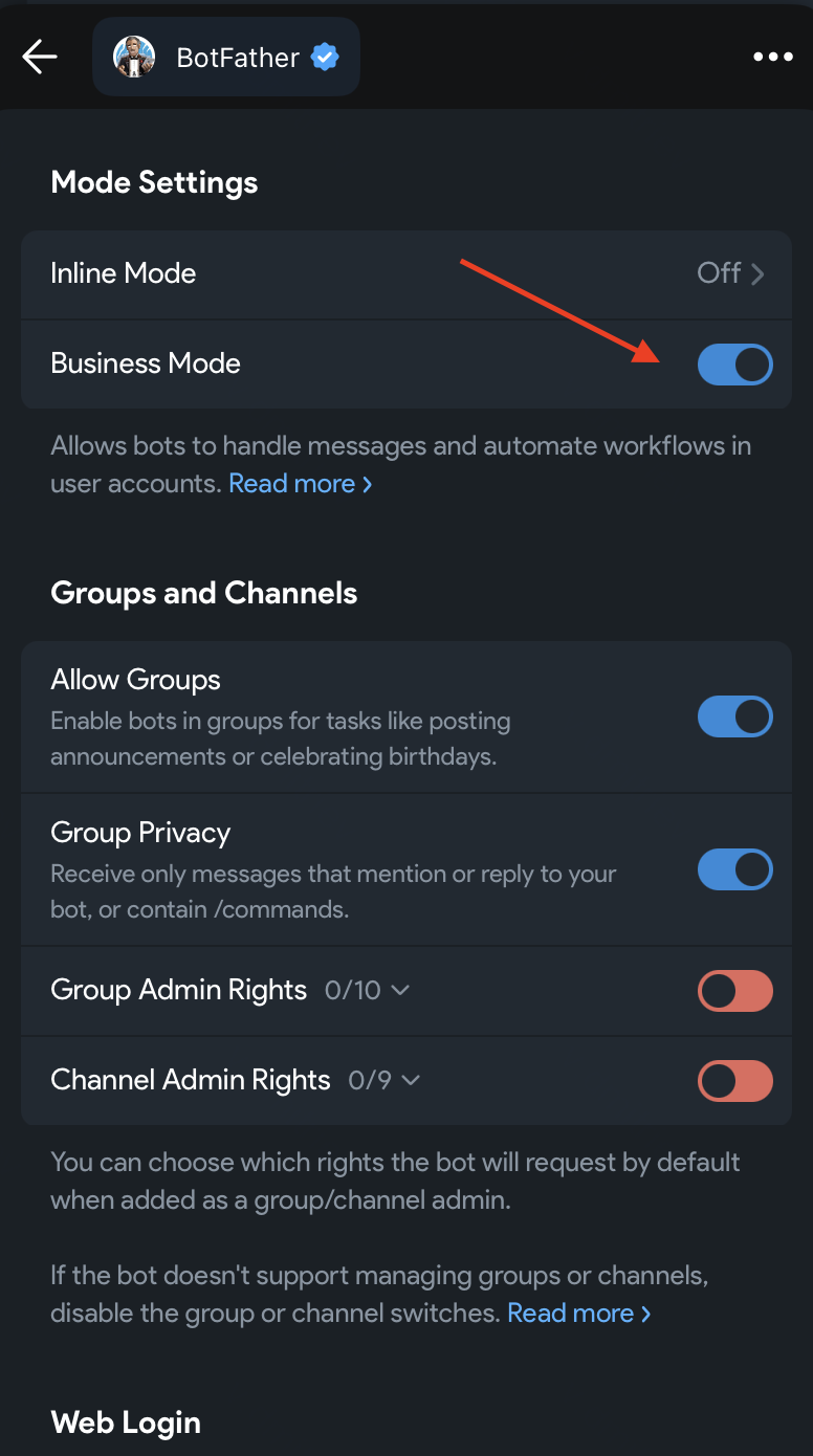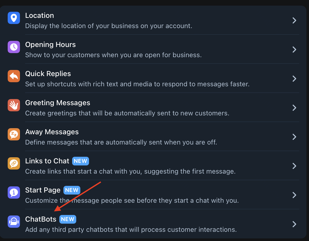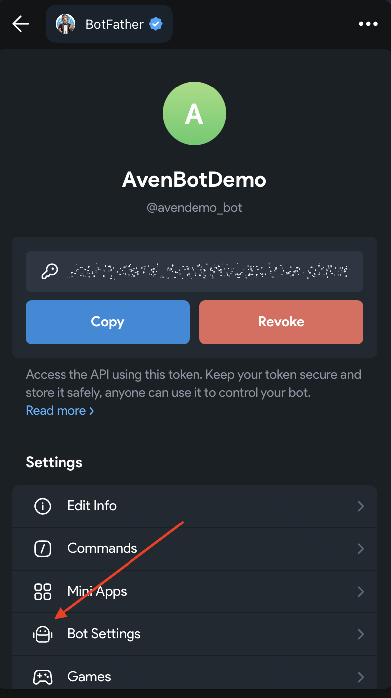 - На появившемся экране перейдите в "Настройки бот", у бота обязательно должен быть включен "Business mode"