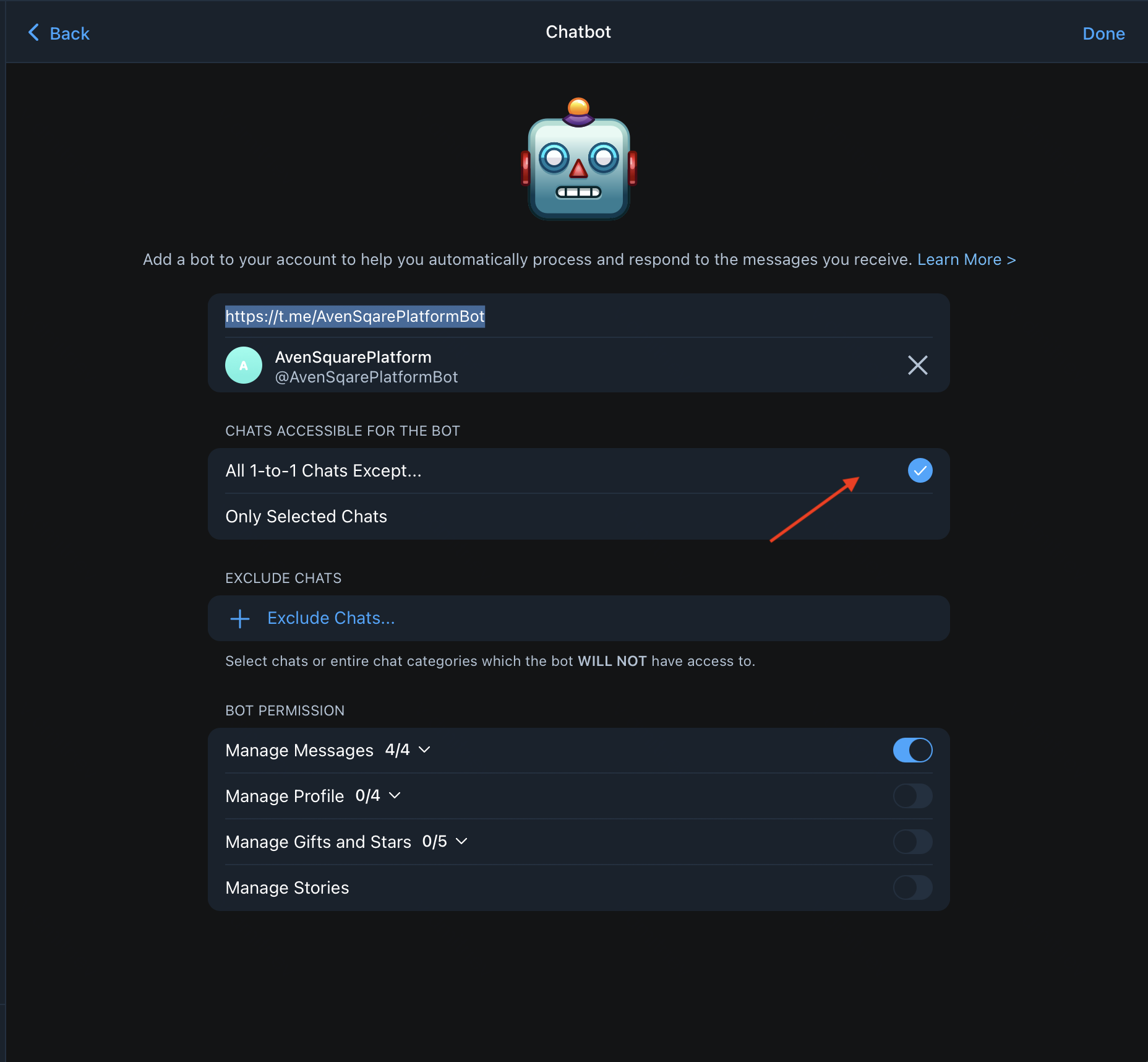 - Добавьте ссылку на своего бота и включите все 1-2-1 сообщения